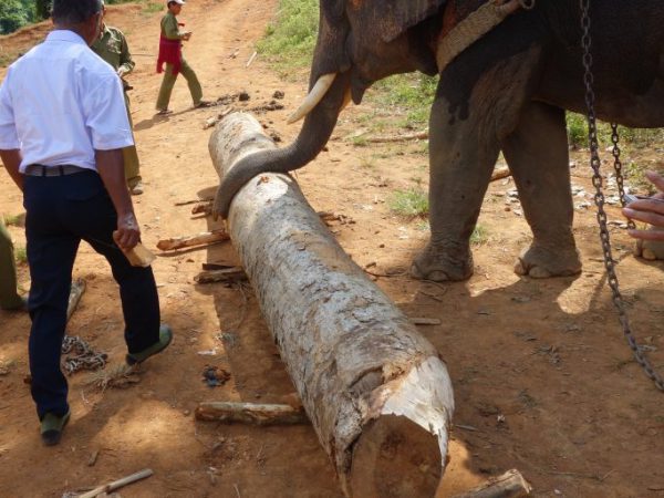 So it is always a great pleasure for me to walk up the track from the road to the elephant camps, with exotic butterflies and dragonflies flitting around, until you round a bend, and there – wow! – right in front of you, 20 or so huge elephants, going about their business. And their business is logging.