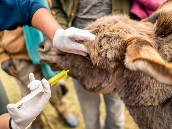Dr Hanna and Dr Mathilde subsequently gave Derese a full health check. They found that Derese’s teeth had become overgrown and some sharp points were rubbing into her cheeks, which had caused ulcers to develop in her mouth. Dental issues like this can make it painful for donkeys to grind and chew their food. The team rasped Derese’s teeth to correct the overgrowth and make her mouth more comfortable.